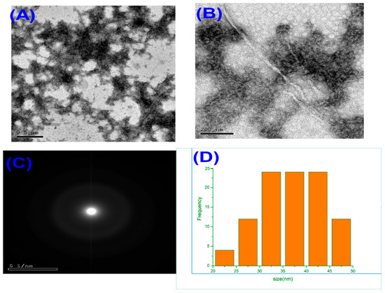 Considering Transmission electron microscopy (TEM) images revealed that the synthesized melittin nanoparticles were uniformly distributed with a predominantly spherical morphology (Figure 1A,B). The nanoparticles appeared well-dispersed without significant aggregation, indicating the efficiency of the synthesis and stabilization process. Additional TEM micrographs at different magnifications are provided in the Electronic Supplementary Material (Figure S1), confirming consistent morphology and nanoscale particle size distribution. The average particle diameter, as determined from TEM measurements, ranged between approximately 25 and 45 nm, with most particles clustering around 35–40 nm. Selected area electron diffraction (SAED) patterns (Figure 1C) displayed diffuse concentric rings, confirming the amorphous nature of the melittin nanoparticles. The particle size distribution histogram (Figure 1D) demonstrated a narrow size distribution, with the majority of particles falling within the nanoscale range of 20–50 nm, and an average size of ~36 nm. This uniformity in size and spherical shape is advantageous for biological applications, as it promotes consistent cellular uptake and predictable pharmacokinetic behavior.