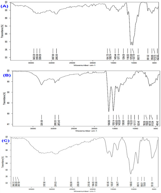 The FTIR spectra of chitosan, melittin, and melittin nanoparticles (MEL-NPs) are presented in Figure 2. The FTIR spectrum of chitosan (Figure 2A) exhibited broad absorption bands at 3432–3286 cm−1, corresponding to overlapping O–H and N–H stretching vibrations, confirming the presence of hydroxyl and amino groups. The absorption band at 1641 cm−1 was attributed to amide I (C=O stretching), while that at 1568 cm−1 corresponded to amide II (N–H bending). Additional peaks at 1150–1028 cm−1 were assigned to C–O–C stretching vibrations of the glycosidic bond in chitosan. The melittin spectrum (Figure 2B) revealed strong N–H stretching vibrations at 3291–2872 cm−1, an amide I band at 1646 cm−1, an amide II band at 1536 cm−1, and characteristic C–N and C–C stretching peaks between 1108–465 cm−1, consistent with its peptide backbone structure. For the melittin nanoparticles (MEL-NPs) (Figure 2C), significant spectral changes were observed. The amide I and amide II bands shifted from 1646 → 1631 cm−1 and 1536 → 1537 cm−1, respectively, accompanied by pronounced broadening of the O–H/N–H stretching region (3942–3187 cm−1). These shifts and broadening effects indicate hydrogen bonding and electrostatic interactions between the amino groups of chitosan and the peptide chains of melittin, confirming the successful encapsulation of melittin within the chitosan–TPP nanoparticle matrix.