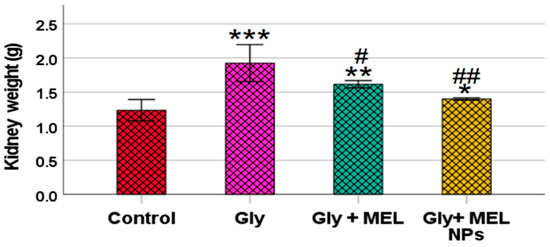 Effect of glyphosate, free melittin, and melittin nanoparticles on kidney weight in rats. Data are expressed as mean ± SD (n = 6). Gly: Glyphosate, MEL: melittin, MEL NPs: melittin nanoparticles. *** p < 0.001 vs. Control group; ** p < 0.01 vs. Control group; * p < 0.05 vs. Control group; ## p < 0.01 vs. Glyphosate group and # p < 0.05 vs. Glyphosate group.