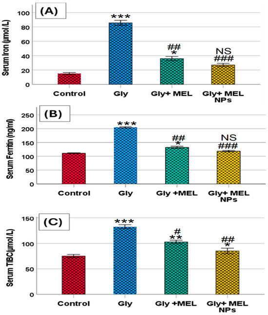 Effect of glyphosate, free melittin, and melittin nanoparticles on serum iron profile: (A) Serum iron (µmol/L), (B) Serum ferritin (ng/mL), and (C) Serum total iron-binding capacity (TIBC; µmol/L). Data are presented as mean ± SD (n = 6). Gly: Glyphosate, MEL: melittin, MEL NPs: melittin nanoparticles. Statistical significance: *** p < 0.001, ** p < 0.01 vs. Control group; * p < 0.05 vs. Control group; ### p < 0.001 vs. Glyphosate group, ## p < 0.01 vs. Glyphosate group; # p < 0.05 vs. Glyphosate group; and NS: non-significant vs. Control group.
