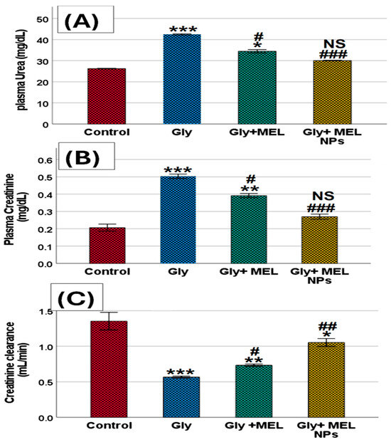 Effect of glyphosate, free melittin, and melittin nanoparticles on renal function biomarkers in rats: (A) Plasma urea (mg/dL), (B) Plasma creatinine (mg/dL), and (C) Creatinine clearance (mL/min). Data are expressed as mean ± SD (n = 6). Gly: Glyphosate, MEL: melittin, MEL NPs: melittin nanoparticles. Statistical analysis: *** p < 0.001, ** p < 0.01 vs. Control group; * p < 0.05 vs. Control group; ### p < 0.001 vs. Glyphosate group, ## p < 0.01 vs. Glyphosate group; # p < 0.05 vs. Glyphosate group; and NS: non-significant vs. Control group.