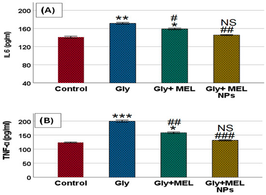 Effect of glyphosate, free melittin, and melittin nanoparticles on serum pro-inflammatory cytokine levels in rats. Bar graphs represent the serum concentrations of (A) interleukin-6 (IL-6) and (B) tumor necrosis factor-alpha (TNF-α) across experimental groups. Data are presented as mean ± SD (n = 6). Gly: Glyphosate, MEL: melittin, MEL NPs: melittin nanoparticles. Statistical significance: *** p < 0.001, ** p < 0.01 vs. Control group; * p < 0.05 vs. Control group; ### p < 0.001 vs. Glyphosate group, ## p < 0.01 vs. Glyphosate group; # p < 0.05 vs. Glyphosate group; and NS: non-significant vs. Control group.