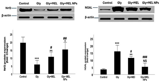 Equal amounts of protein (30 μg) were separated by 10% SDS-PAGE and electro-transferred to Hybond™ nylon membranes (GE Healthcare, Chicago, IL, USA) [18]. Membranes were blocked with 5% non-fat dry milk in Tris-buffered saline with 0.1% Tween-20 (TBST) for 1 h at room temperature. For the immunoblotting analysis, primary antibodies were employed, including an NRF2 polyclonal antibody (Invitrogen, Carlsbad, CA, USA, PA5-27882, 1:1000 dilution; molecular weight ~97–100 kDa), an anti-NGAL antibody (Abcam, Cambridge, UK, ab63929; dilution 1:1000; molecular weight ~25 kDa), and an anti-β-actin antibody (Abcam, ab8226, 1:5000 dilution) as a loading control. To visualize the bound primary antibodies, a horseradish peroxidase (HRP)-conjugated goat anti-rabbit IgG secondary antibody was applied at a working concentration of 0.1–0.5 µg/mL. After overnight incubation at 4 °C, membranes were washed in TBST, and signals were detected using enhanced chemiluminescence (ECL). Band intensities were then quantified by densitometric analysis using ImageJ software (version 1.53t, National Institutes of Health, Bethesda, MD, USA).