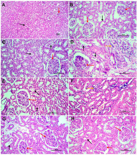 For the preparation of histological sections of different investigated groups, kidney tissue samples were fixed in 10% neutral buffered formalin for 24 to 36 h at room temperature. The fixed tissues were dehydrated at room temperature using ascending grades of ethyl alcohol, cleared in xylene, and embedded in paraffin at 70 °C. Paraffin blocks were sectioned at a thickness of 5 µm. The sections were deparaffinized in xylene, rehydrated through descending grades of ethanol, and rinsed in running tap water. Hematoxylin and eosin (H&E) staining was performed by incubating the sections in hematoxylin for 7 min at room temperature, followed by washing under running water and incubation in eosin for 2 min. The stained sections were rinsed again in running tap water, dehydrated through ascending grades of ethanol, cleared in xylene, and mounted using Dibutylphthalate Polystyrene Xylene (DPX) for microscopic examination.