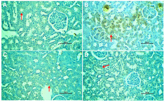 Four-micrometer sections of formalin-fixed, paraffin-embedded kidney tissues were deparaffinized in xylene, rehydrated in descending grades of ethanol, and rinsed with running tap water. To block endogenous peroxidase activity, sections were incubated in 3% hydrogen peroxide (H2O2) for 10 min at room temperature. Antigen retrieval was performed by heating the sections in 0.01 mmol/L citrate buffer (pH 6.0) at 92 °C for 20 min. After cooling and washing with phosphate-buffered saline (PBS), the sections were incubated for 1 h at room temperature with the primary antibody: Anti-BAX rabbit monoclonal antibody (Clone SP47, Cat. No. ab81083, Abcam, Cambridge, UK). Following PBS washes, sections were incubated with an appropriate biotinylated secondary antibody (goat anti-rabbit for BAX), followed by incubation with streptavidin–biotin complex for 10 min. After washing with PBS, immunoreactivity was visualized using 3,3′-diaminobenzidine (DAB) as the chromogen for 15 min at room temperature (ScyTek, P.O. Box 3286, Logan, UT, USA). Nuclear counterstaining was performed using Harris’ hematoxylin for 2 min, followed by rapid washing with tap water. Sections were dehydrated in ascending alcohol concentrations, cleared in xylene, and mounted using DPX. The expression of BAX was assessed based on the percentage of positively stained cells and the intensity of staining. Examination and image capture were conducted using a binocular Olympus microscope (Model CX40 RF200, Olympus Optical Co., Ltd., Tokyo, Japan).
