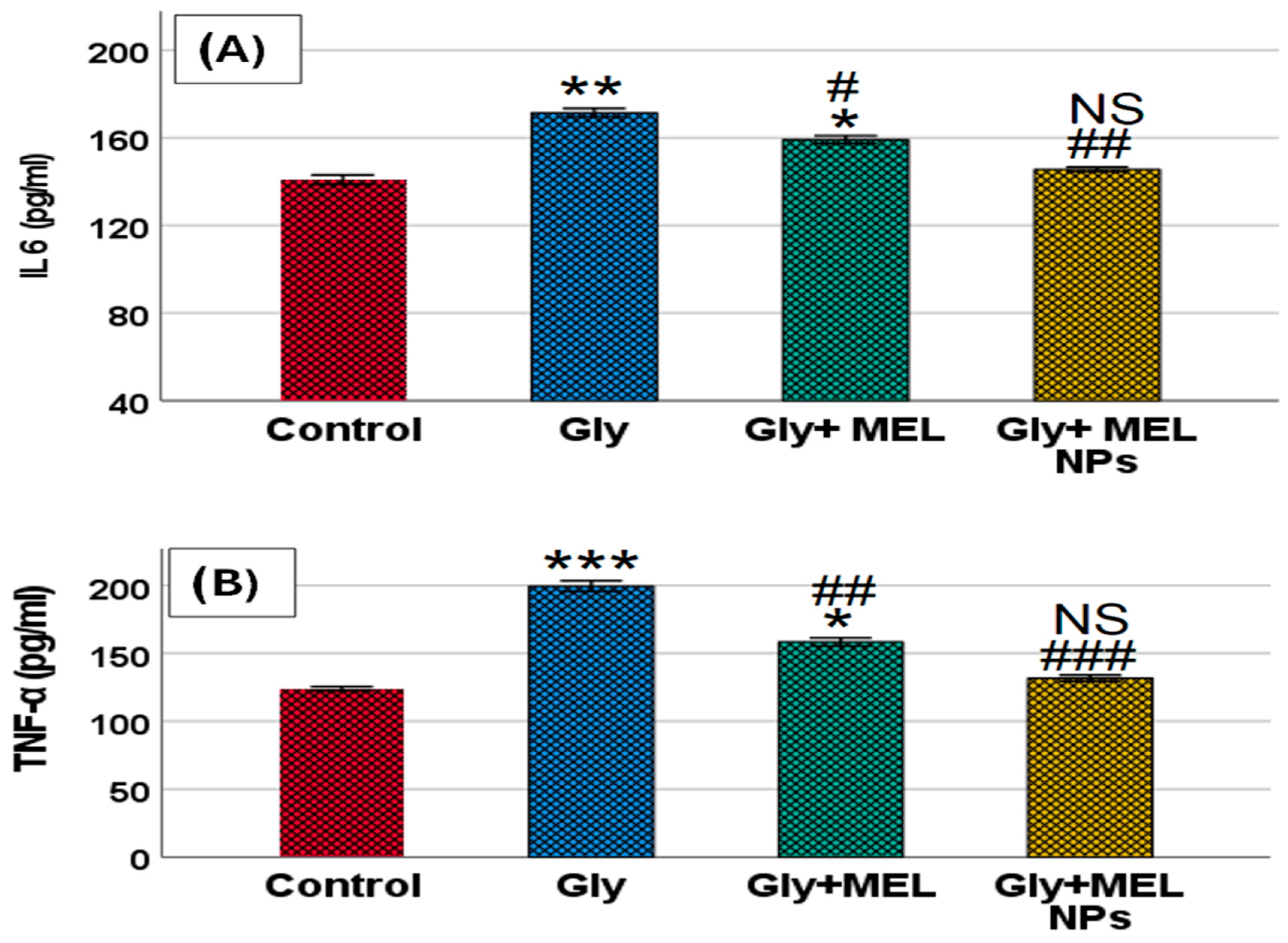 | Gly + MEL NPs | 7.49 ± 0.42 NS,### | 3.71 ± 0.18 NS,### | 3.78 ± 0.34 *,### |