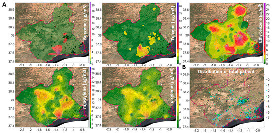 Mean concentrations of volatile organic compounds (VOCs) in the Region of Murcia, Spain. (A) Threshold limit values: benzene (5 µg/m3), ethylbenzene (10 µg/m3), toluene (80 µg/m3), m,p-xylene (10 µg/m3), and o-xylene (5 µg/m3). (B) Geographical distribution of patients.