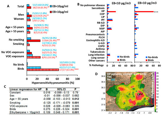Although the association between EB10-area residence and HP appeared modest, a robust association emerged among EB10-area residents with avian exposure (63.0% vs. 27.4%, p < 0.001) or occupational VOC exposure (19.5% vs. 7.9%, p < 0.05), compared to unexposed individuals. Conversely, as previously reported [22], the prevalence of HP was lower in patients who smoked, even in the EB10 areas (5.2% vs. 2.6%). Neither sex nor age significantly influenced HP frequency (Figure 2A). Notably, avian exposure did not correlate with other pulmonary diseases in EB10 areas (Figure 2B).
