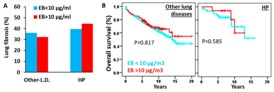 High environmental ethylbenzene levels do not affect the incidence of fibrosis or overall survival in patients with HP or other lung diseases. (A) Percentage of patients with lung fibrosis among those with other lung diseases (Other-L.D.) and hypersensitivity pneumonitis (HP); and (B) Kaplan–Meier survival curves and log-rank tests for overall survival in patients with other lung diseases and HP, stratified by the ethylbenzene threshold limit of 10 µg/m3 (EB10). Patients with cancer were excluded from these analyses.