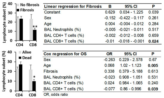 Lower CD8+ T cell counts in bronchoalveolar lavage (BAL) samples from HP patients are associated with a higher incidence of fibrosis and reduced overall survival. Mean ± SEM percentages of CD4+ and CD8+ T lymphocytes in BAL are shown for patients with or without lung fibrosis (top) and for surviving versus deceased HP patients (bottom). Linear multivariate and Cox regression analyses for fibrosis and overall survival in HP patients were performed, including sex, age, presence of lung fibrosis, and BAL counts of neutrophils, CD4+, and CD8+ T lymphocytes as variables. * p < 0.05 and ** p < 0.01 by Student’s t-test, values in bold indicate statistically significant differences.