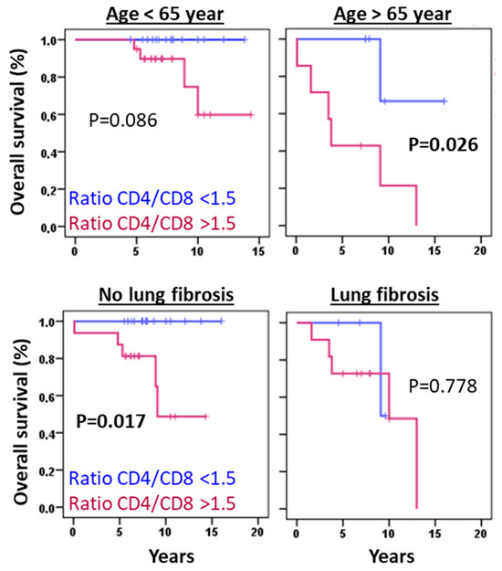 Ratio of CD4/CD8 lymphocytes maintains its predictive value regardless of the age or the lung fibrosis status of patients. Kaplan–Meier and Log-Rank tests for OS of HP patients younger or older than 65 years or without or with lung fibrosis according to the ratio of CD4/CD8 lymphocytes above 1.5.
