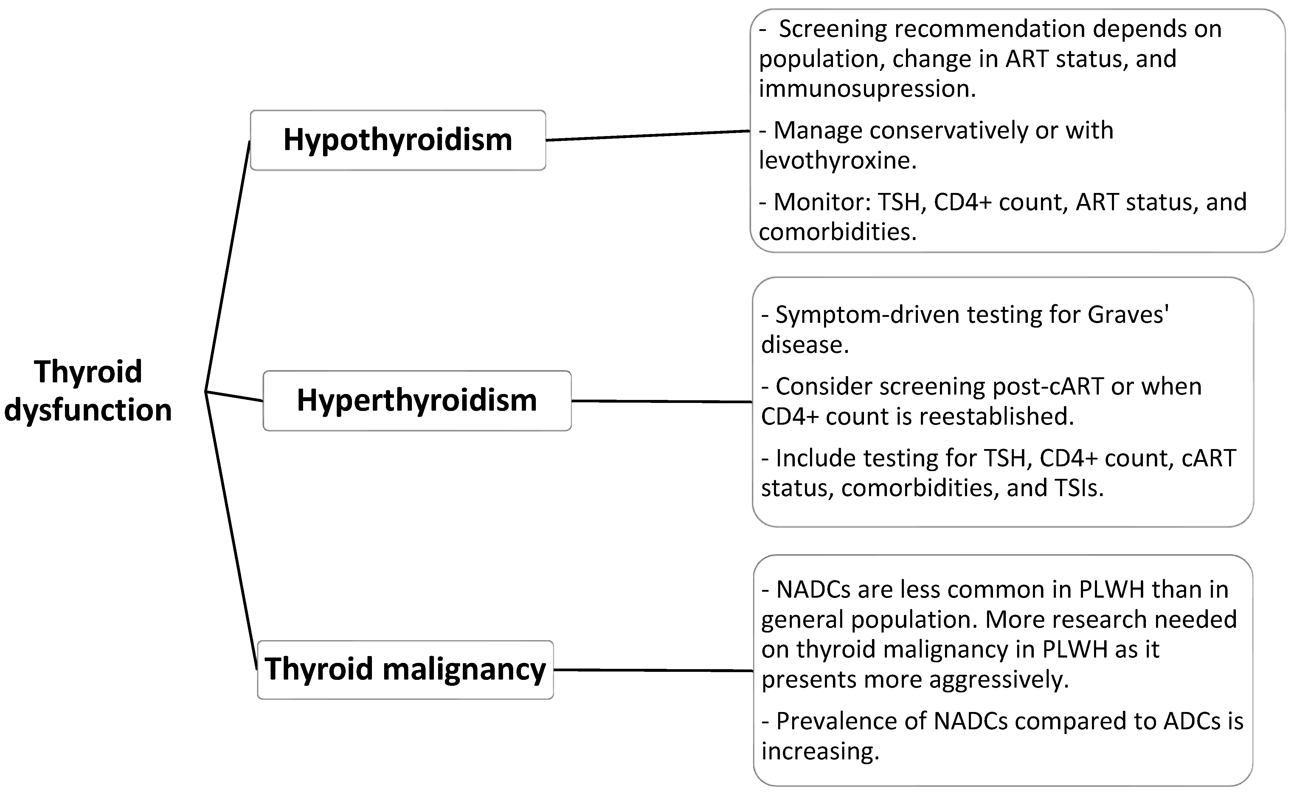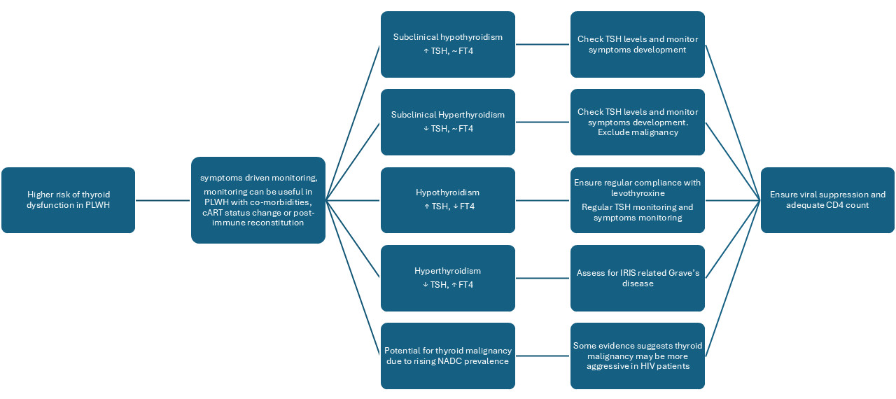 | Subclinical hypothyroidism | 3.5–6.6% | High TSH, normal FT4; linked with cART and normal CD4+ count | Routine After change in cART status; with reduced CD4 count; with IRIS | [8] |