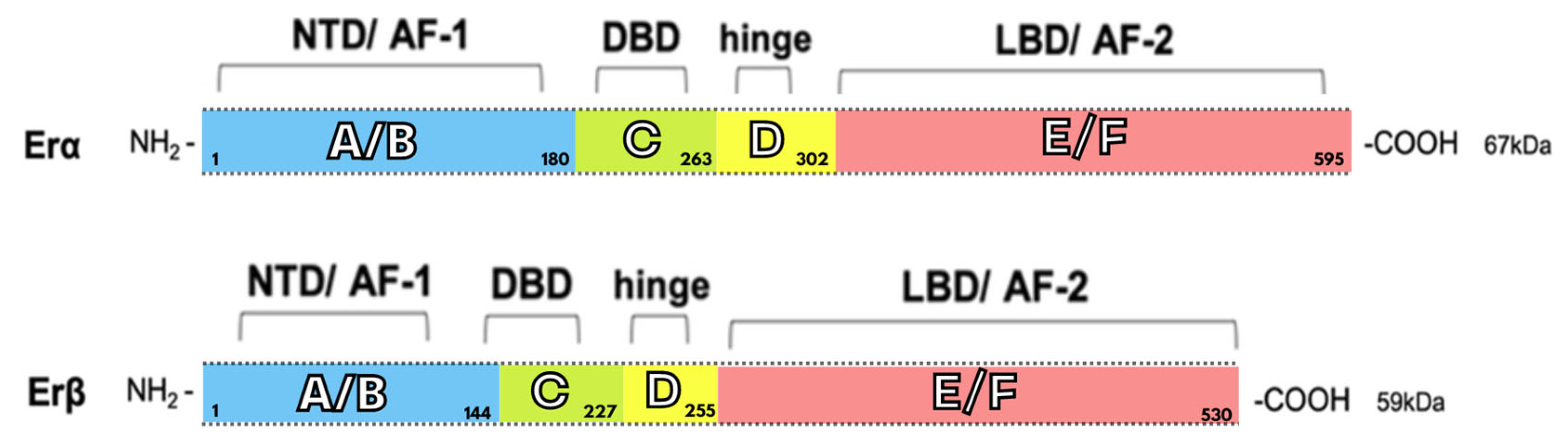 It is evident that estrogen receptors alpha and beta are classified as members of the superfamily of nuclear receptors. The analysis revealed that they exhibit common structural features in several regions. However, their functional domains demonstrate significant differences. ERα consists of 595 amino acids and has a molecular weight of 67 kDa. Conversely, ERβ comprises 530 amino acids and has a molecular weight of 59 kD (Figure 1). This variation between the two proteins is due to the shorter amino domain present in the beta receptor. In humans, the alpha receptor is encoded by the ESR1 (estrogen receptor 1) gene. Its location on chromosome 6 is at locus 6q25.1 [18,24].