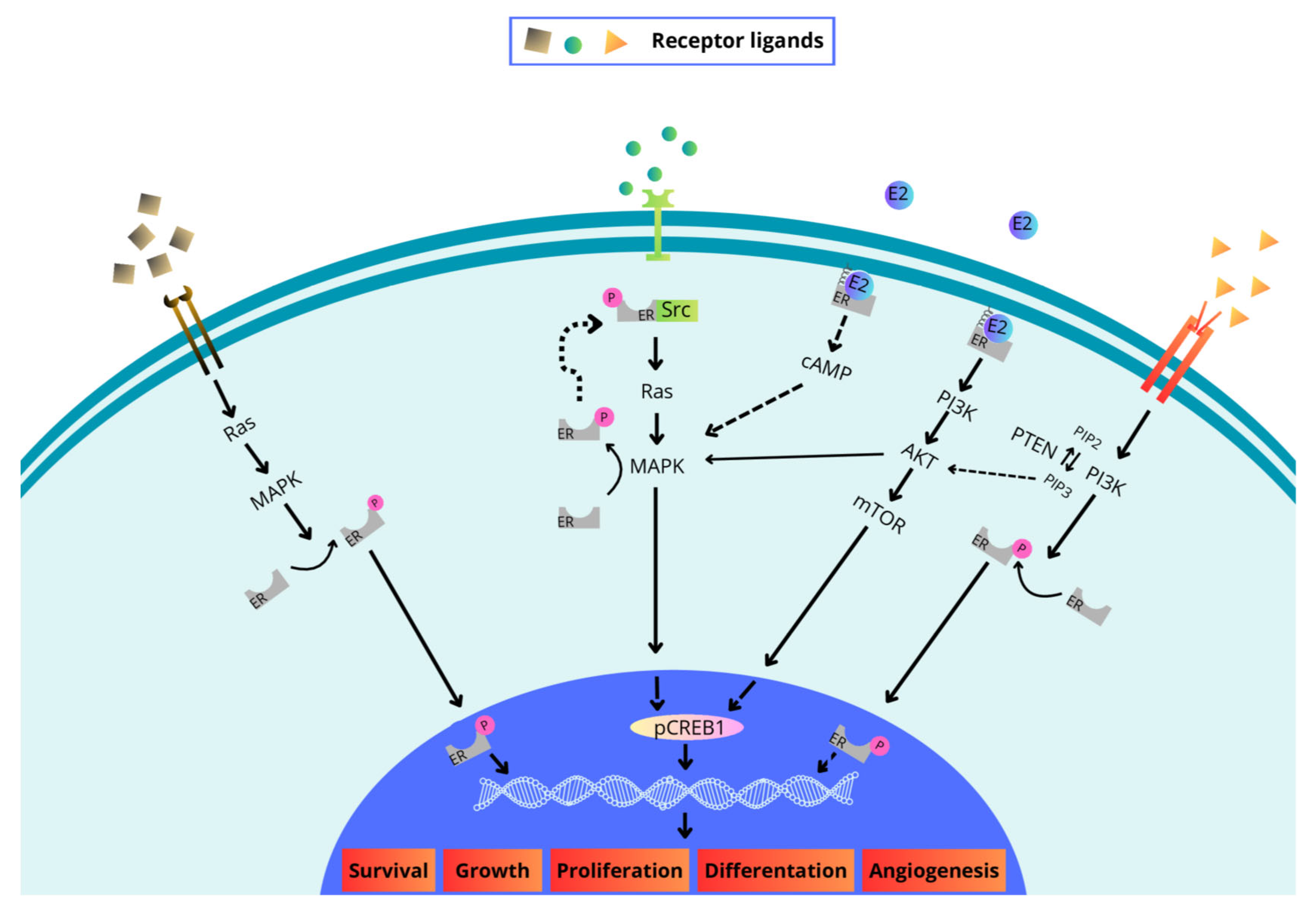 Figure 2. The role of the ER in the activation of various signaling pathways in cells. ER: estrogen receptor; Ras: GTPase HRas; MAPK: mitogen-activated protein kinase; P: phosphorylated form; Src: proto-oncogene tyrosine-protein kinase; pCREB1: phosphorylated cAMP-responsive element-binding protein 1; cAMP: cyclic adenosine monophosphate; PI3K: phosphatidylinositol 3-kinase; AKT: protein kinase B; mTOR: mammalian target of rapamycin; PTEN: phosphatidylinositol-3,4,5-trisphosphate 3-phosphatase; PIP2: phosphatidylinositol 4,5-bisphosphate; PIP3: phosphatidylinositol 3,4,5-trisphosphate.