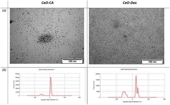The results of analysis of nanoceria sols used to create hydrogels via transmission electron microscopy (a); electrokinetic zeta potential of sols after ultrasound treatment (b). On the left is CeO-CA NPS, and on the right is CeO-Dex NPs.