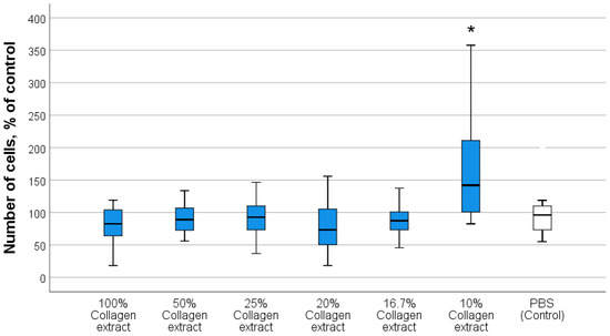 The investigated CCE concentrations were as follows: the stock CCE solution (in the article referred to as 100% collagen, viscous, undiluted); 50% collagen (1 part CCE + 1 part phosphate buffer); 25% (1 part CCE + 3 parts phosphate buffer); 20% (1 part CCE + 4 parts phosphate buffer); 16.7% (1 part CCE + 5 parts phosphate buffer); and 10% collagen (1 part CCE + 9 parts phosphate buffer). The obtained results, which indicated improved outcomes at low collagen concentrations, prompted us to include an additional group with 1% collagen in the study.