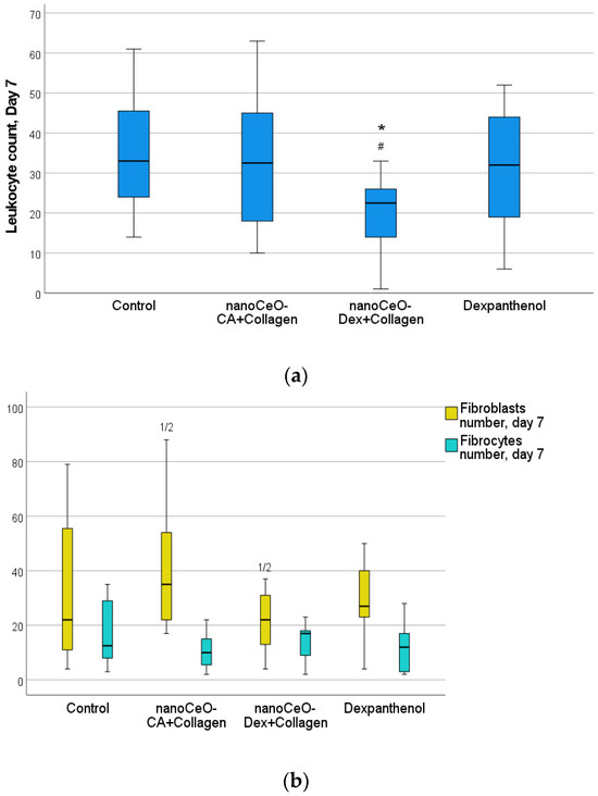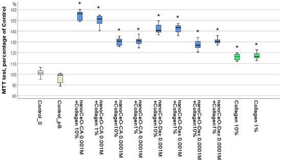 Our previous studies demonstrated that the maximum stimulation of cell metabolism and proliferation (including fibroblasts), with no sign of cytotoxicity, was observed for nanocerium samples at concentrations of 10−3 M to 10−4 M, regardless of the synthesis method or coating type [57,58,59,64]. Consequently, we investigated eight groups of collagen–nanocerium composite samples to identify the optimal variants (Table 2): CeO2 (10−3 M)-CA + Collagen (10%), CeO2 (10−4 M)-CA + Collagen (10%), CeO2 (10−3 M)-CA + Collagen (1%), CeO2 (10−4 M)-CA + Collagen (1%); CeO2 (10−3 M)-Dex + Collagen (10%), CeO2 (10−4 M)-Dex + Colagen (10%), CeO2 (10−3 M)-Dex + Collagen (1%), and CeO2 (10−4 M)-Dex + Collagen (1%). Two collagen groups (1% and 10%) were also investigated. The results were compared between the control and PBS groups.