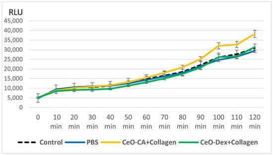 The E. coli MG1655 pXen7 strain carries a constitutive, constantly expressed lac promoter, and is used to detect general toxicity or the effect of test substances on the bioluminescence process [70]. This allows the exclusion of false-positive results when testing inducible biosensors on the same line [71,72]. The collagen–nanocerium composites were tested on the E. coli MG 1655 pXen7 biosensor for general toxicity, recorded as luminescence suppression relative to the control. Luminescence was assessed using absolute values and relative units (percentage of the control).
