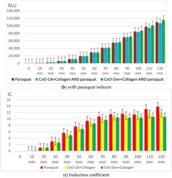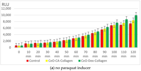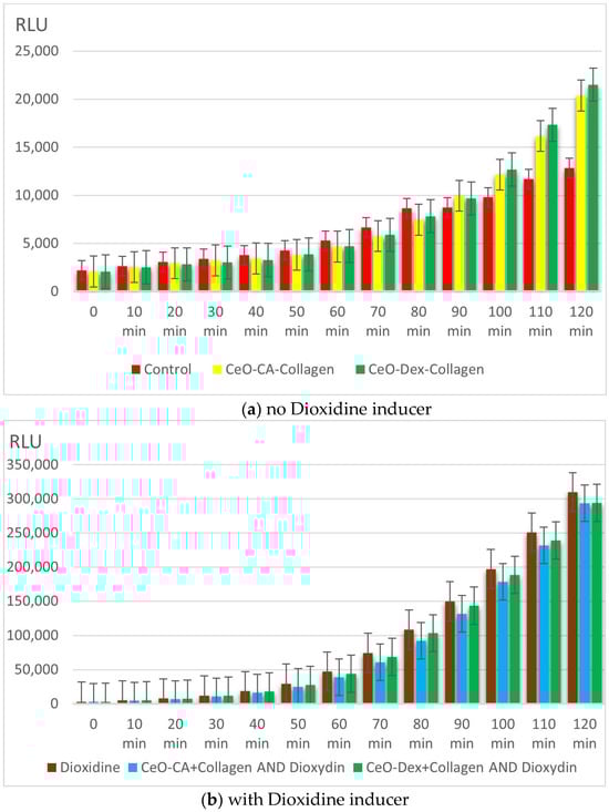 The SOX-inducible promoter PrecA of the E. coli MG1655 pRecA strain detects the penetration of DNA-damaging agents into cells [65,73]. The bioluminescent biosensor E. coli MG1655 pRecA was used to study the promutagenic and antigenotoxic activities of the collagen–nanocerium composites. This strain has been used to test substances for their ability to damage and protect DNA [74,75,76,77].