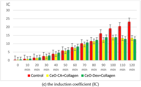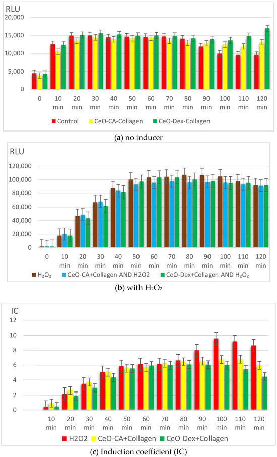 The selected nanocomposite prototypes (CeO-CA + Collagen and CeO-Dex + Collagen) were studied using bacterial biosensors to determine their biological activity and safety. Four types of bioluminescent E. coli were used in this study (Table 3). This allowed us to study the following parameters: general toxicity, antioxidant and pro-oxidant activities, and antigenotoxic and promutagenic activities.