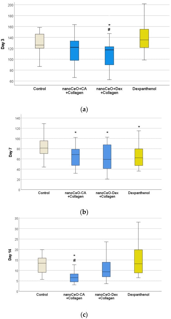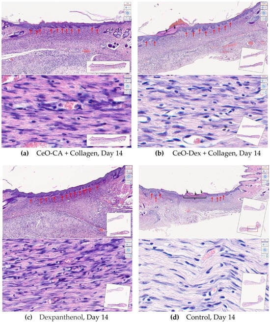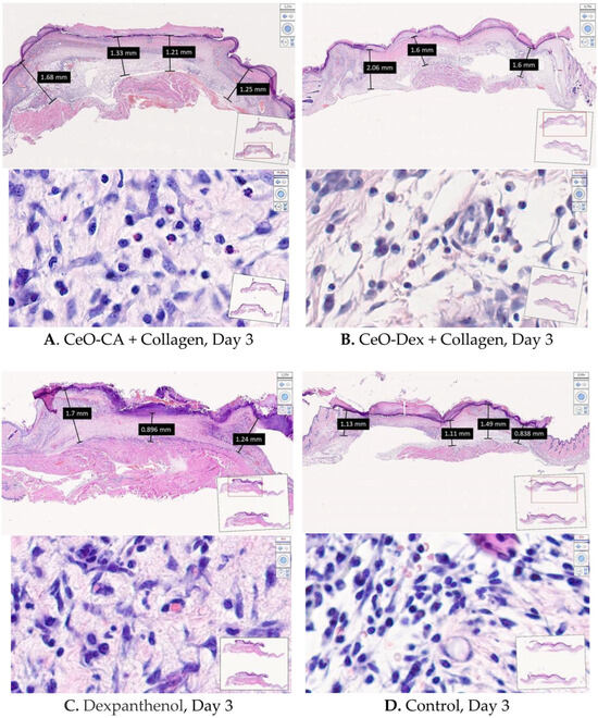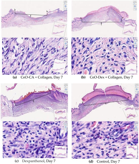 The investigated nanodrug prototypes were applied to the wound or wound area once daily at a dose of 0.2 mL until complete wound healing and the formation of a connective tissue scar, regardless of changes in wound size. Four experimental wound groups were analyzed, which differed in their treatment methods. Two study groups were investigated: CeO-CA + Collagen and CeO-Dex + Collagen groups. Dexpanthenol (5% ointment for external use) was selected for comparison. This medication belongs to the pharmacological group of regenerative drugs and is indicated for the treatment of wounds and burns (Gross formula: C9H19NO4, Tatkhimpharmpreparaty, Kazan, Russia). The control group consisted of wounds treated with a 0.9% NaCl solution (0.2 mL).