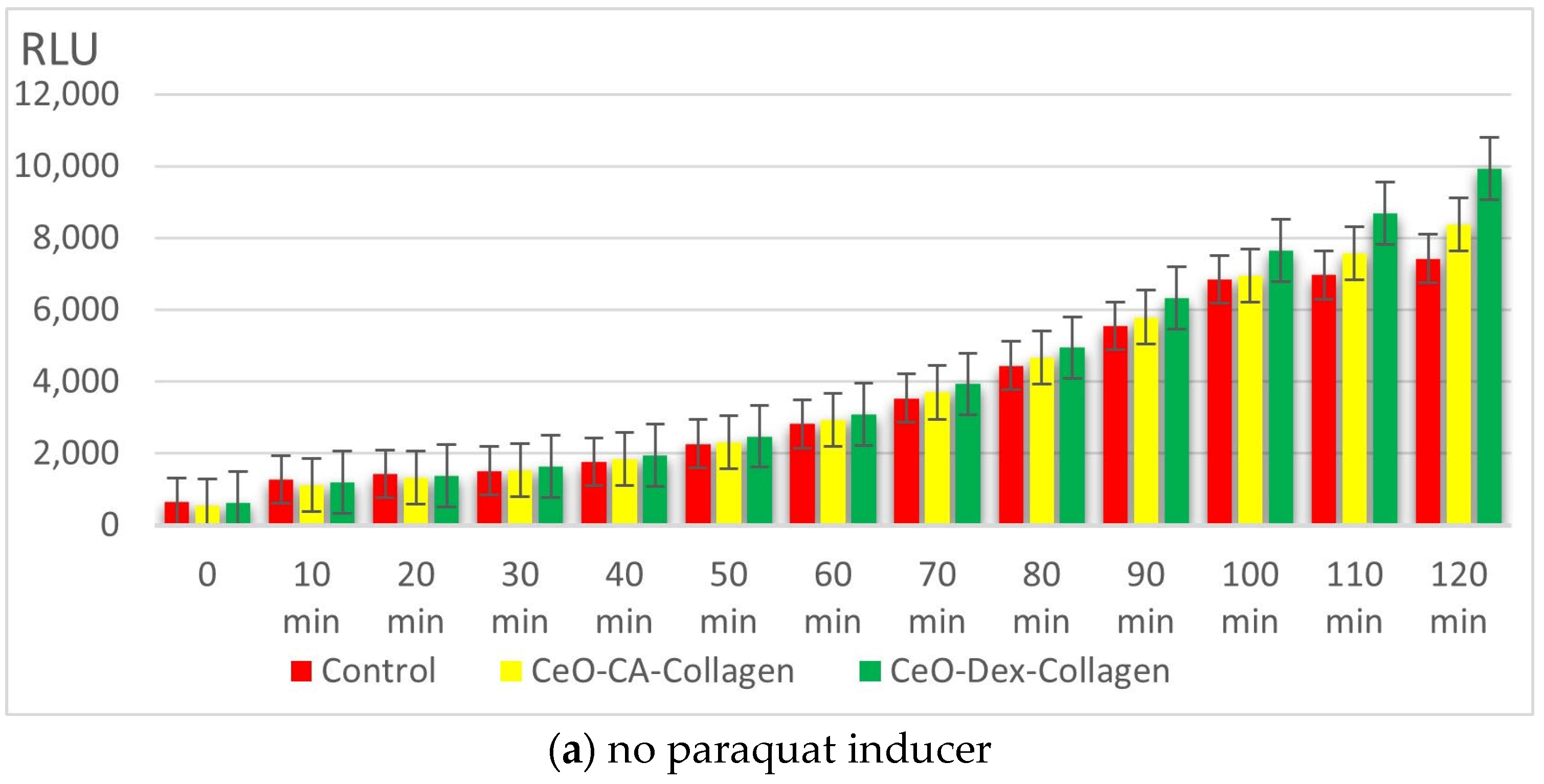 3.3.1. Results of Collagen–Nanocerium Composites Testing for General Toxicity on the E. coli MG 1655 pXen7 Biosensor
