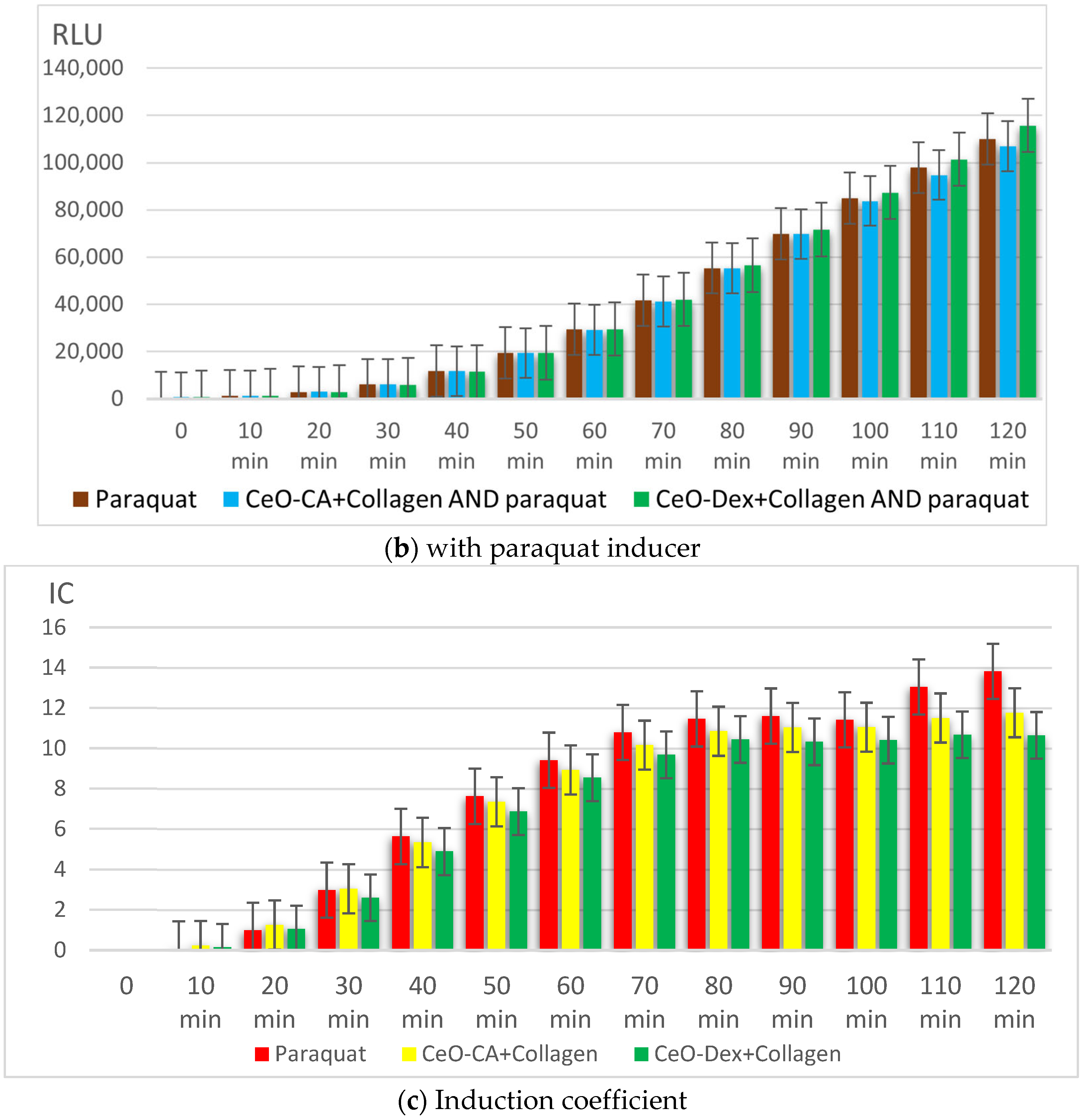 - Studies on bacterial lux-biosensors have provided data on induction and protective activity for parameters such as general toxicity, antioxidant, pro-oxidant, antigenotoxic, and promutagenic activities. It was established that the nanocomposites did not demonstrate a toxic effect but possessed antigenotoxicity at a level of up to 45% as well as antioxidant activity against H2O2 (up to 49% in the CeO-Dex + Collagen group and 31% in the CeO-CA + Collagen group), thus exhibiting a protective effect.
