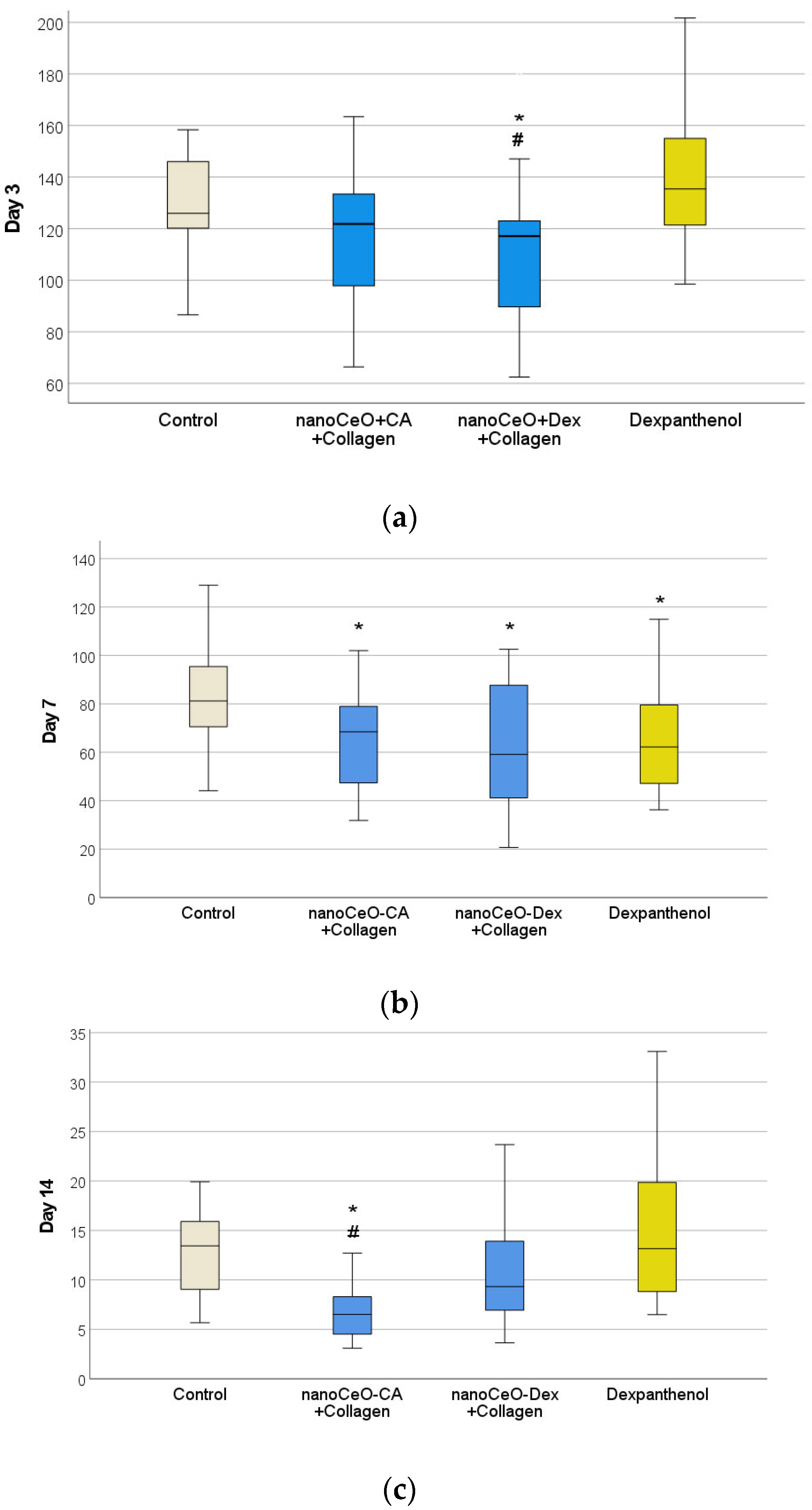 | Control (C) | CeO-CA + Collagen + (1) | CeO-Dex + Collagen (2) | Dexapantenol (D) | p-Value (Total) | p-Value with the Bonferroni Correction | |