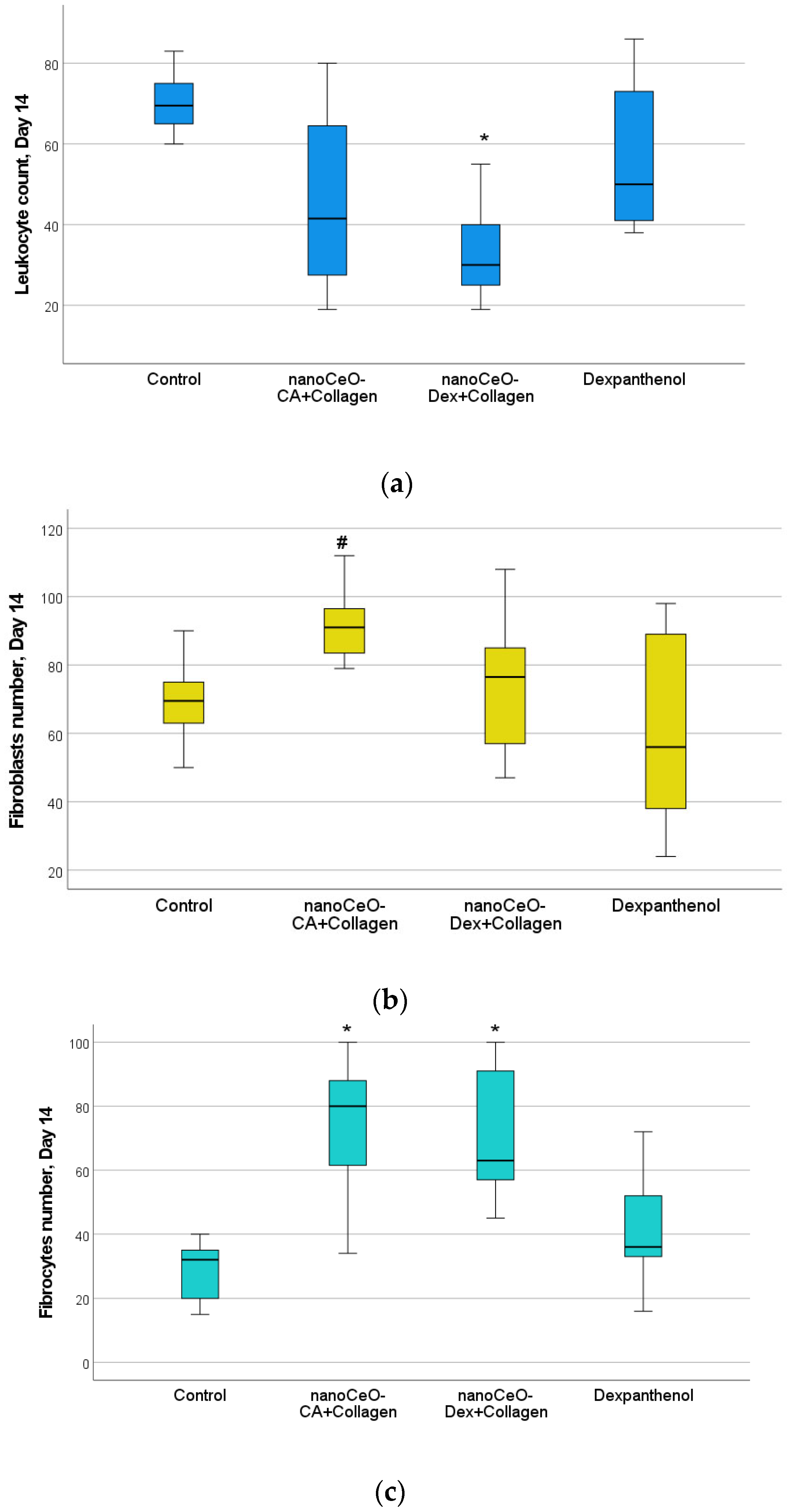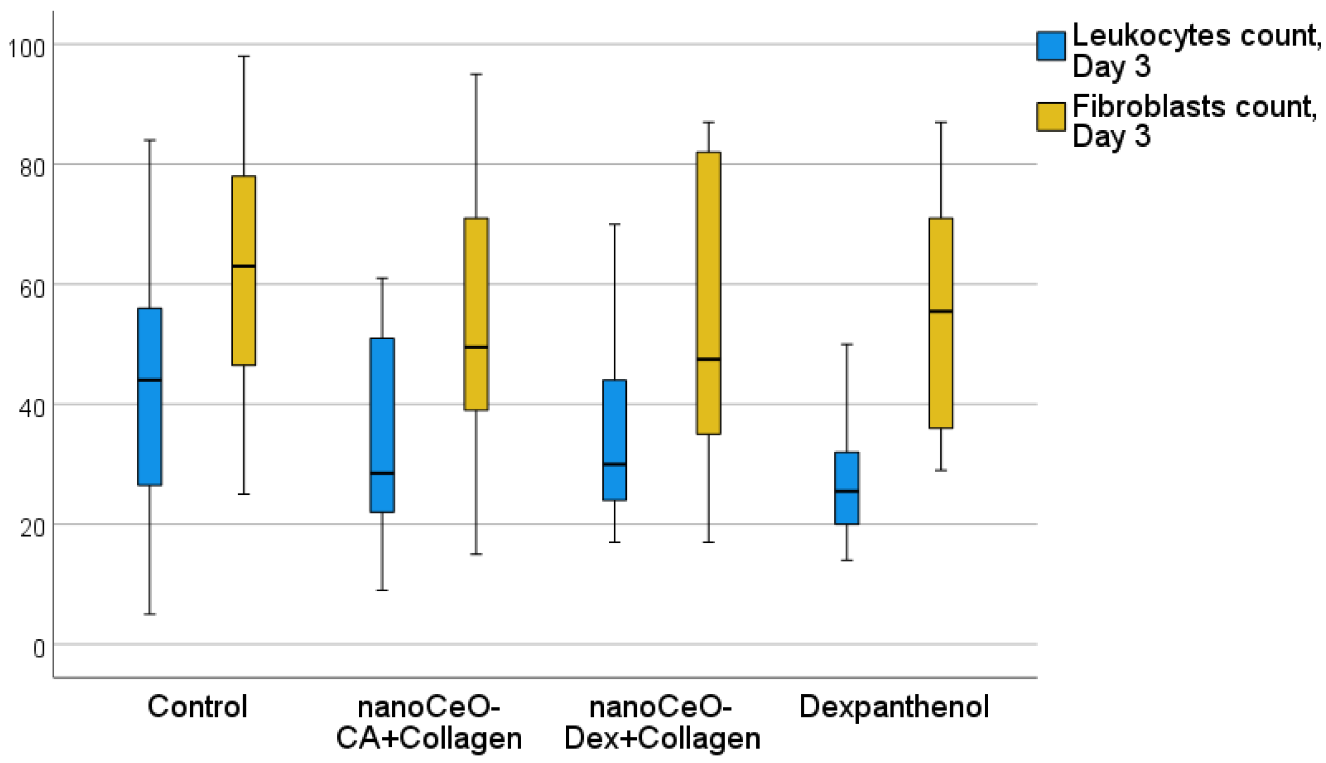 | Day | Number of Cells in the | Control (C) | CeO-CA + Collagen + (1) | CeO-Dex + Collagen (2) | Dexapantenol (D) | p-Value (Total) | p-Value with the Bonferroni Correction |