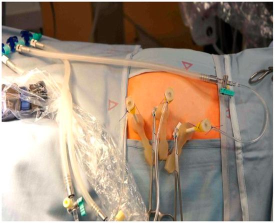 Under maternal transabdominal ultrasound guidance, three trocars (external trocar diameter 5 mm—Terumo Radifocus Introducer II R*SA 11K10SQ Fr. 11) (Miniature Straight Forward Telescope, Karl Stortz, Tuttlingen, Germany) were percutaneously inserted into the amniotic cavity using the Seldinger technique (Figure 1) [9]. However, the first needle we use to enter the amniotic cavity is the Entuit® Secure Adjustable Gastrointestinal Suture Anchor Set. Thus, the hollow needle that would be used in the Seldinger technique is substituted with a needle holding the anchor set. After entering the uterus, we introduce the round-tipped guide wire that pushes the anchor into the amniotic cavity. This anchor is attached to a string outside the abdominal wall. Wrenching the string we pull back the anchor against the amniotic sac and uterine wall, holding the two together and somewhat pulling the uterus towards the abdominal wall of the patient. We then continue with introducing the trocar. The anchor stays inside the amniotic cavity holding the amniotic sac against the uterus. In three cases where T-fasteners were not available as a means for maintaining apposition of membranes, uterine wall, and maternal abdominal wall throughout the procedure, we placed anti-eventration sutures close to the trocar sites.