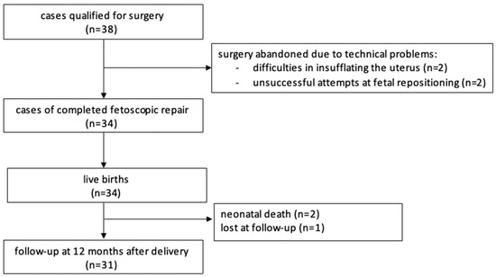 The presented study has several limitations. First, the sample size was small. This study aimed to describe the first fetoscopic surgeries for spina bifida aperta in Poland and therefore the number of patients was limited to 34 subjects. As a consequence, the results should be considered as preliminary and interpreted with caution. Because of the small sample size it was not possible to analyze outcomes based on the closure techniques which evolved during the study. Further research involving larger cohorts is necessary to validate these findings and support the hypothesis. Second, the follow-up period was short. Assessment of long-term outcomes, especially after more than 12 months, could provide more comprehensive insights into the efficacy and safety of the procedure.