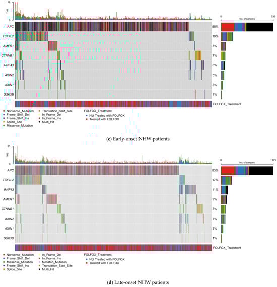 - Alshenaifi, J.Y.; Vetere, G.; Maddalena, G.; Yousef, M.; White, M.G.; Shen, J.P.; Vilar, E.; Parseghian, C.; Dasari, A.; Morris, V.K.; et al. Mutational and co-mutational landscape of early onset colorectal cancer. Biomarkers 2025, 30, 64–76. [Google Scholar] [CrossRef] [PubMed]