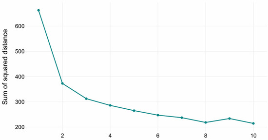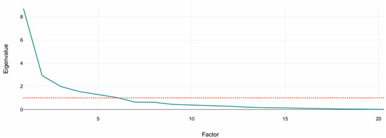 Figure 1 shows the scree plot of eigenvalues. A sharp drop between PC1–PC3 followed by a gradual flattening supports the retention of the first six to seven components, which exceed the Kaiser threshold (eigenvalue = 1). These retained components were subsequently used as input features for the K-Means clustering analysis described in Section 3.2.
