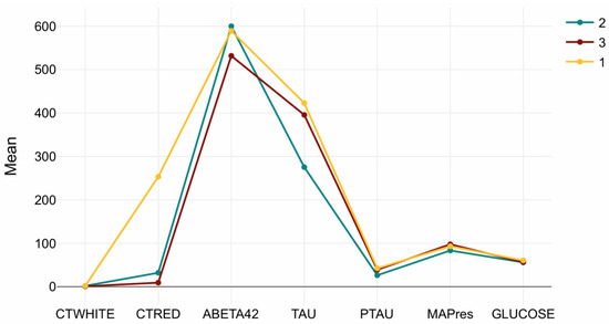 Cluster-wise mean values are presented in Table 3. The Tau/CTRED-high profile in Cluster 1 is characterized by markedly elevated Tau, pTau, and CTRED levels, consistent with tauopathy and erythrocyte-related or vascular mechanisms. Cluster 2, which exhibited preserved brain volumes, showed higher Aβ42 and lower Tau/pTau, representing a low-amyloid, low-tau phenotype suggestive of earlier disease stages or slower progression. Cluster 3, in contrast, demonstrated reduced Aβ42 combined with elevated Tau/pTau, forming a tau-dominant, amyloid-low profile typical of more advanced pathology.