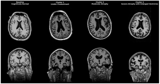 AD is a heterogeneous neurodegenerative disorder that could be classified anatomically and biologically into distinct groups. Neuropathological studies post mortem first identified limbic predominant, hippocampal-sparing, and typical AD. Interestingly, patients with the hippocampal-sparing type died earlier and were men, while those with the limbic-predominant type were women who died older [17]. Neuropathological subgroups were later replicated in imaging cohort studies, solidifying AD variety in atrophy patterns. Representative MRI scans of each identified cluster are shown in Figure 4, highlighting the limbic-predominant (Cluster 1), volume-preserved (Cluster 2), and diffuse atrophy with ventriculomegaly (Cluster 3) subtypes, alongside a cognitively normal baseline for comparison. While our clustering primarily focused on structural and CSF-derived biomarkers, future research might include epigenetic and transcriptomic signatures to improve endophenotype definitions. Recent studies indicate that DNA methylation, microRNA regulation, and gene expression networks impact amyloid processing, tau phosphorylation, and neuroinflammation, influencing regional vulnerability in AD [18,19,20]. These molecular aspects could increase biological accuracy and help link imaging-based subtypes with their cellular mechanistic profiles.