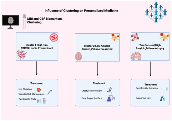 Influence of clustering in personalized medicine. This figure illustrates clustering’s impact on personalized Alzheimer’s medicine using MRI and CSF biomarkers, identifying three groups: Cluster 1 (High Tau/CTRED, Limbic Predominant), Cluster 2 (Low Amyloid, Volume Preserved), and Cluster 3 (Tau-Focused, High Amyloid, Diffuse Atrophy). Each has unique treatment options like iron chelation, tau trials, lifestyle changes, and support, showing clustering’s role in tailored AD treatment.