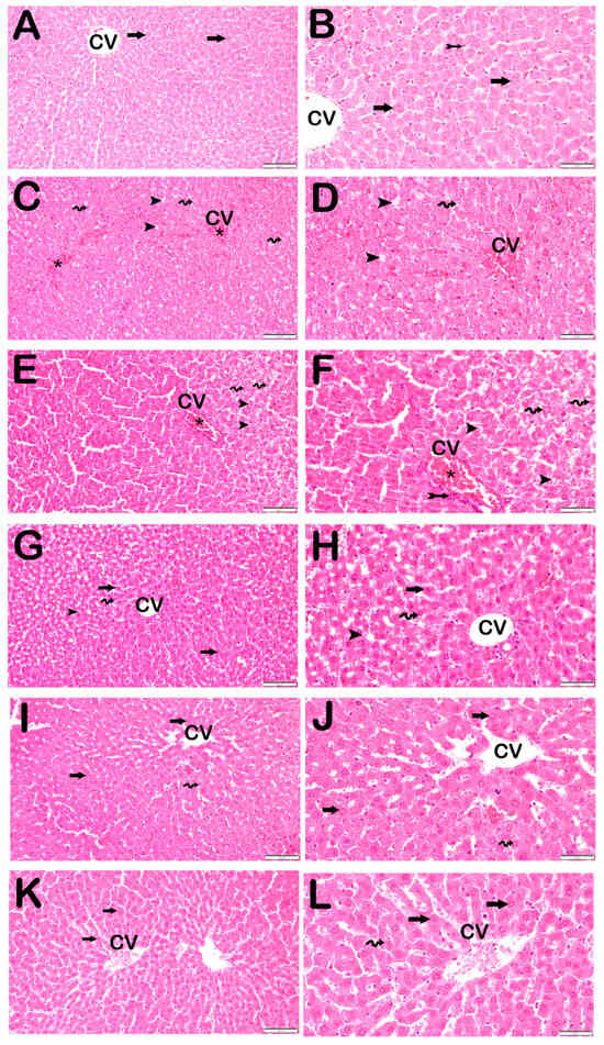 Representative light microscopic image of liver tissue sections stained with H&E. Central Ven (CV). For each marker, liver sections from eight rats per group (total N = 48) were analyzed. Each rat contributed five sections (8 × 6 groups × 5 = 240 sections in total), and 10 non-overlapping microscopic fields per section were evaluated at 20× and 40× magnification. (A) (×20), (B) (×40): Control group. Normal hepatocytes arranged in hepatic cords (arrow) and Kupffer cells within the sinusoids (tailed arrow) are observed. (LDS score: 0 (0–0)). (C) (×20), (D) (×40): STZ group. Necrotic hepatocytes with intralobular distribution and steatotic hepatocytes (spiral arrow) containing cytoplasmic lipid vacuoles (arrowhead) are evident, accompanied by widespread vascular congestion (asteriks). (LDS score: 8 (8–9)). (E) (×20), (F) (×40): STZ + DOXO group. Periportal (bridging necrosis) and intralobular necrosis (tailed arrow) are observed along with steatotic hepatocytes (spiral arrow) containing cytoplasmic lipid vacuoles (arrowhead) and vascular congestion (asteriks). (LDS score: 10 (9–11)). (G) (×20), (H) (×40): STZ + DOXO + TMZ group. Normal hepatocytes are arranged in hepatic cords (arrow). Reduced necrotic hepatocytes (arrowhead) and vascular congestion are noted. The number of steatotic hepatocytes (spiral arrow) has also decreased. (LDS score: 3 (2–3)). (I) (×20), (J) (×40): STZ + DOXO + DAPA group. Normal hepatocytes are arranged in hepatic cords (arrow). A decrease in necrotic hepatocytes (spiral arrow) is observed in both intralobular and periportal areas. (LDS score: 3 (3–4)). (K) (×20), (L) (×40): STZ + DOXO + TMZ + DAPA group. Normal hepatocytes are arranged in hepatic cords (arrow). A marked reduction is seen in both necrotic and steatotic hepatocytes (spiral arrow). (LDS score: 2.5 (2–3)).