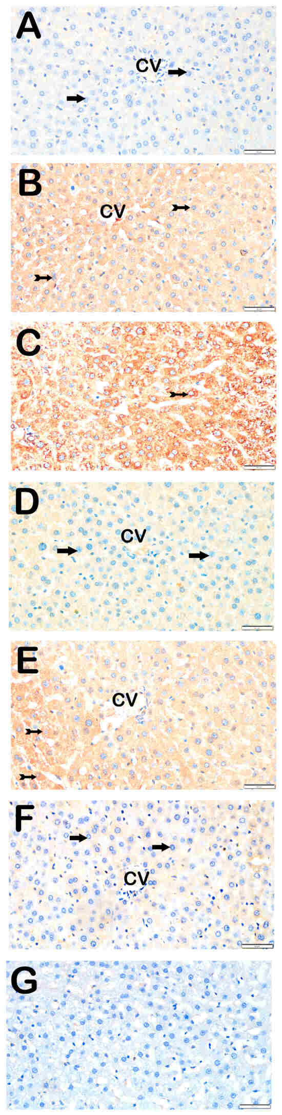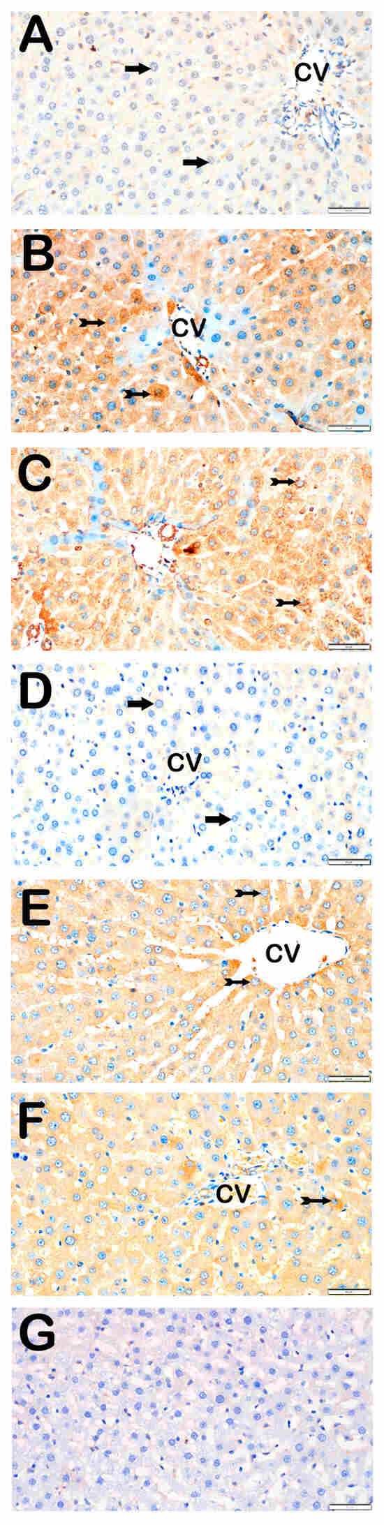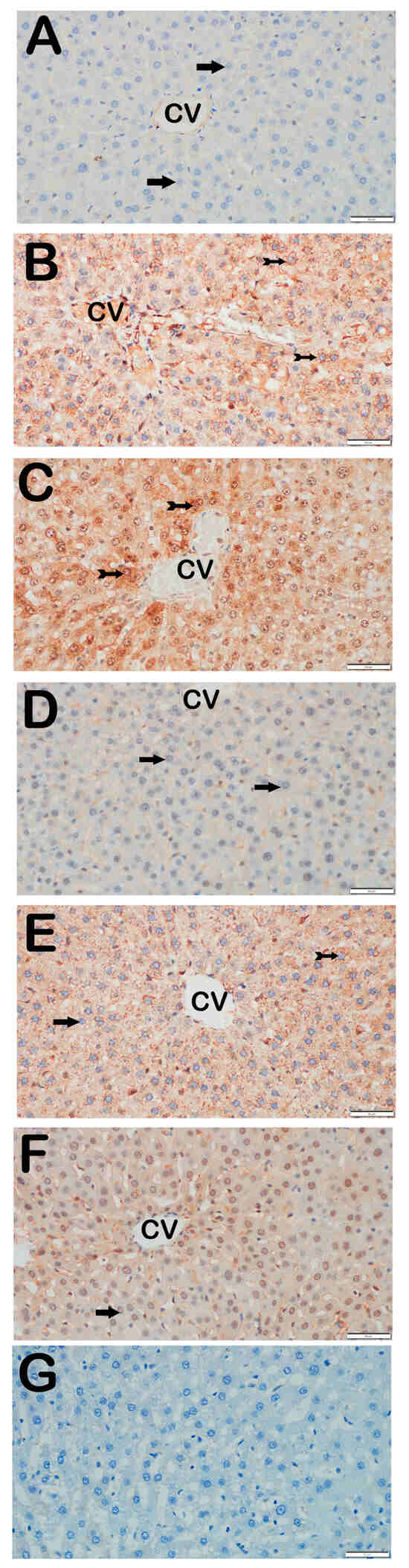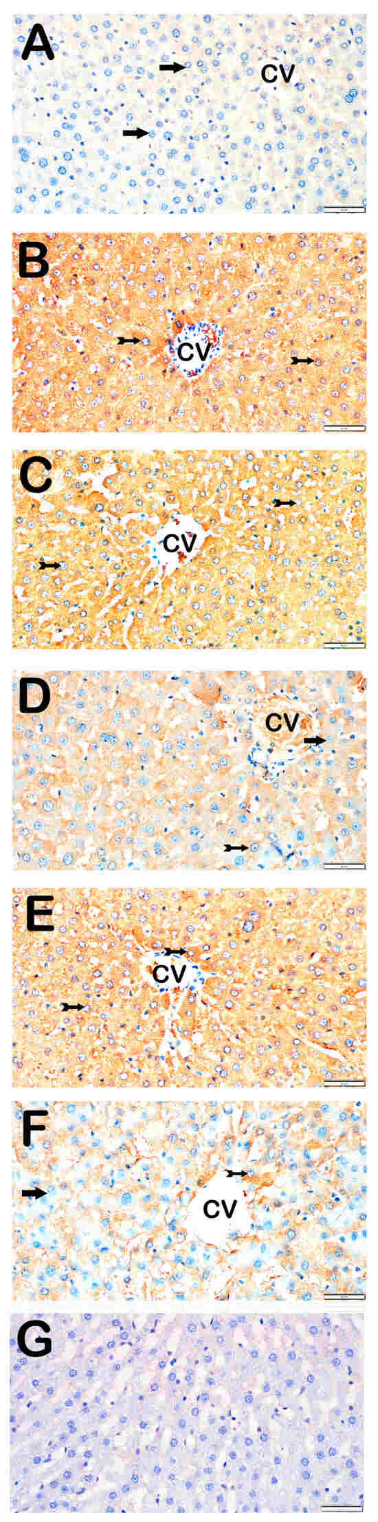 Representative light microscopic images of liver tissue sections incubated with TGF-β1 primary antibody. For each marker, liver sections from eight rats per group (total N = 48) were analyzed. Each rat contributed five sections (8 × 6 groups × 5 = 240 sections in total), and 10 non-overlapping microscopic fields per section were evaluated at 40× magnification. (A) (×40): Control group. Hepatocytes in hepatic cords are immunonegative for TGF-β1 (arrow). (TGF-β1 positivity score: 0 (0–0)). (B) (×40): STZ group. Numerous hepatocytes showing strong TGF-β1 positivity are observed in hepatic cords (tailed arrow). (TGF-β1 score: 2 (1–2)). (C) (×40): STZ + DOXO group. Increased number of TGF-β1-positive hepatocytes is evident in intra- and perilobular areas (tailed arrow). (TGF-β1 score: 2 (2–3)). (D) (×40): STZ + DOXO + TMZ group. A marked reduction in TGF-β1-positive hepatocytes is seen, especially in perilobular regions (arrow). (TGF-β1 score: 1 (0–1)). (E) (×40): STZ + DOXO + DAPA group. TGF-β1-positive hepatocytes are reduced in intra- and perilobular areas (tailed arrow). (TGF-β1 score: 2 (1–2)). (F) (×40): STZ + DOXO + TMZ + DAPA group. A significant decrease in TGF-β1-positive hepatocytes is observed in hepatic cords (arrow). (TGF-β1 score: 0.5 (0–1)). (G) (×40): Negative control sections processed in parallel without primary antibody showed no specific staining, confirming the specificity of the immunohistochemical procedure. n = 8 rats per group.