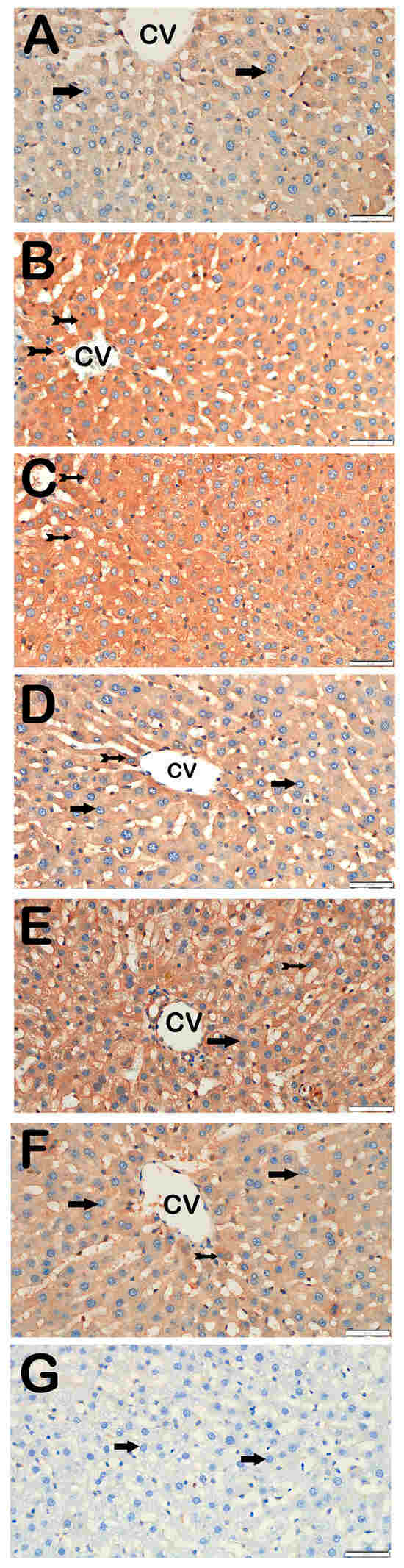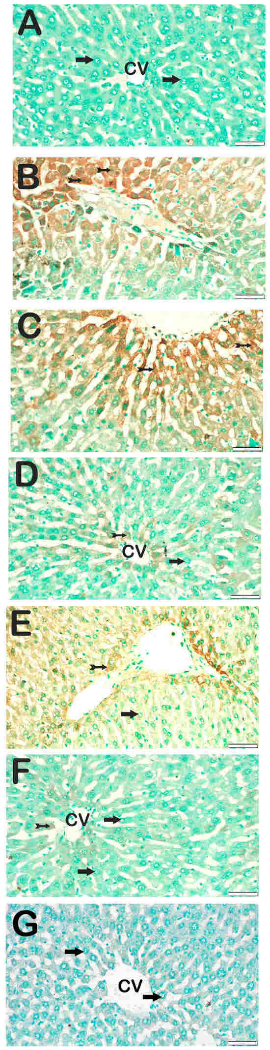 Histological features such as intralobular degeneration, periportal bridging necrosis, steatosis, and vascular congestion were markedly evident in these groups.