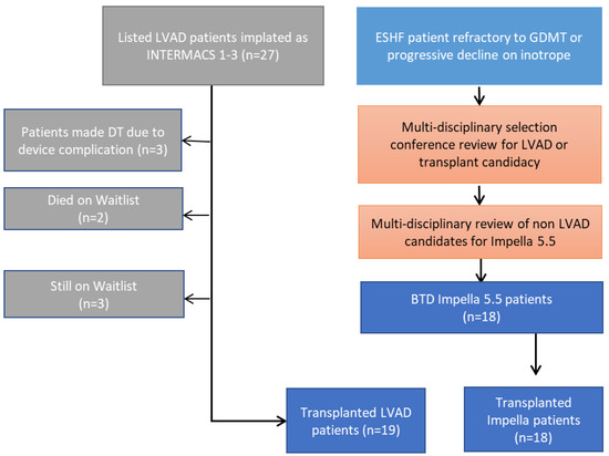 Before non-emergent mechanical support placement, all patients were reviewed in our multi-disciplinary transplant selection committee for appropriateness—including review of anatomy, current heart failure functional class and stage, and risk for mortality while awaiting solid organ transplantation. Discussed patients had already been presented or listed for heart or heart–kidney transplantation or were accepted as hospital-to-hospital transfer in cardiogenic shock, necessitating escalation to temporary mechanical circulatory support (Figure 1)