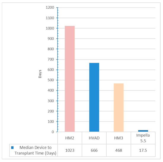 Comparison of the median device to transplant time (in days) between INTERMACS 1−3 patients from the time of device placement (p < 0.001 across all groups compared to Impella 5.5).