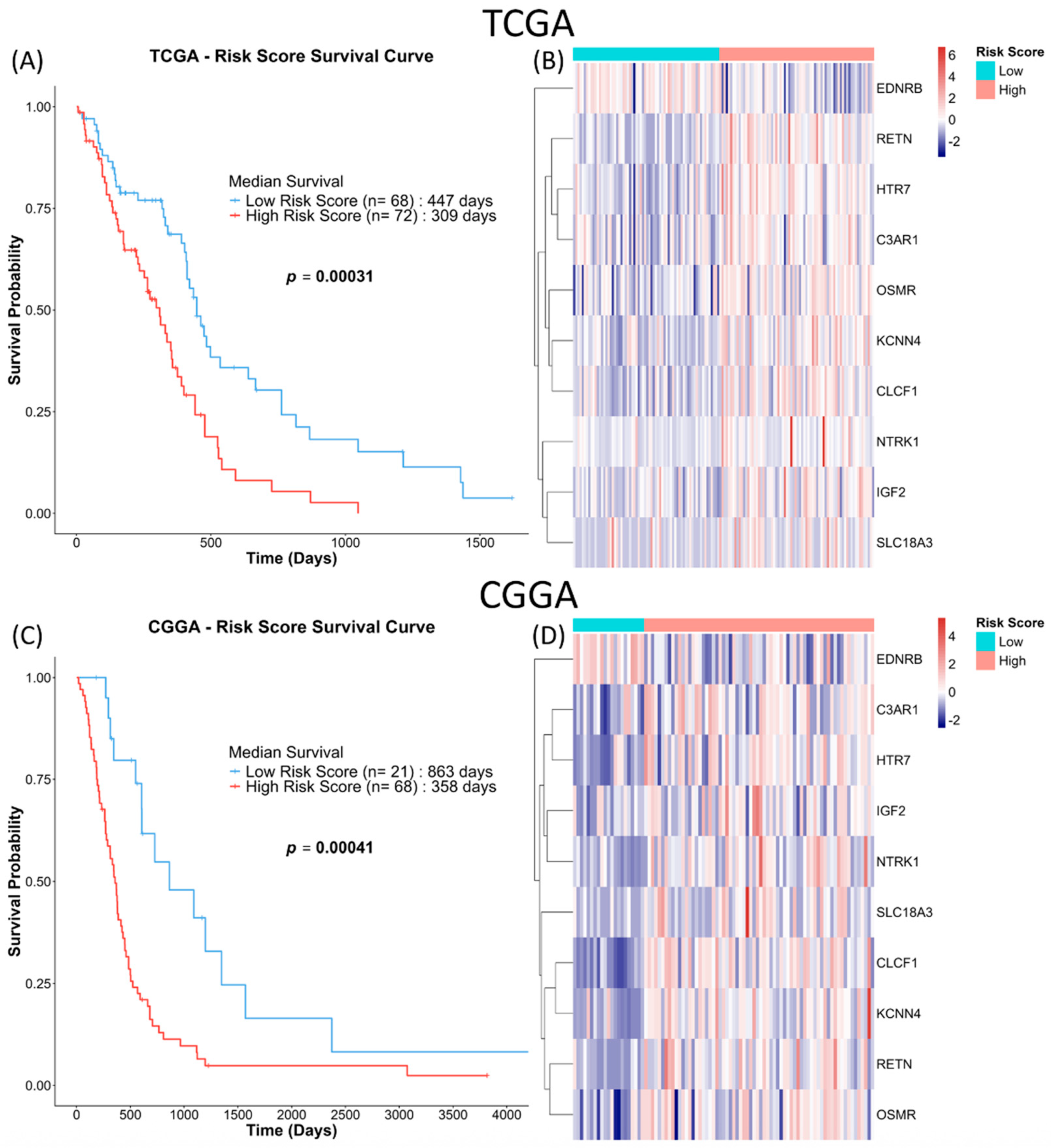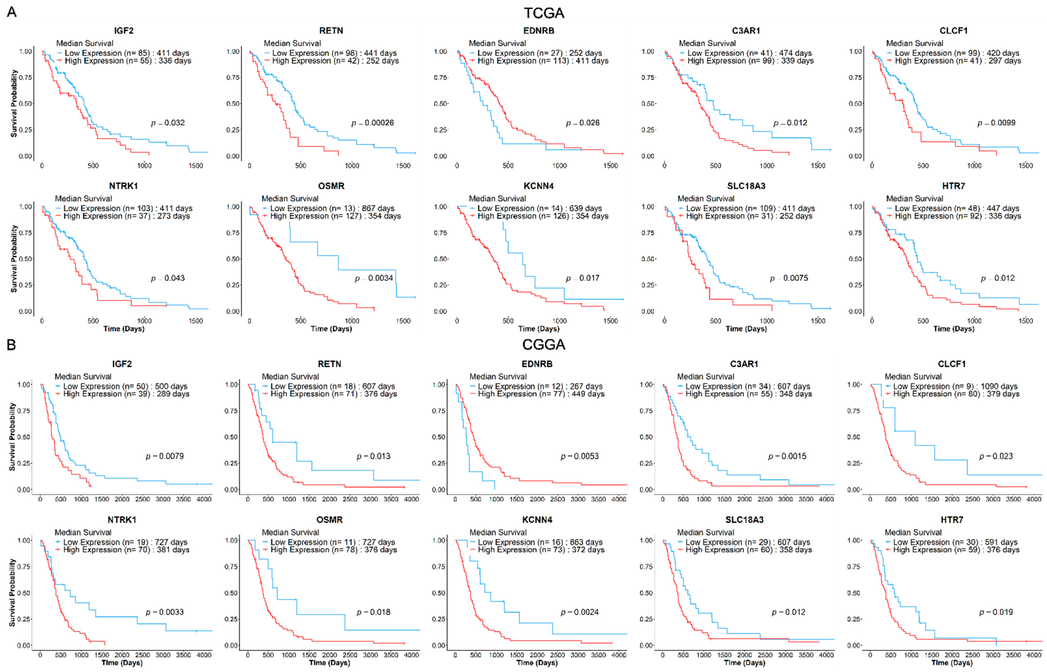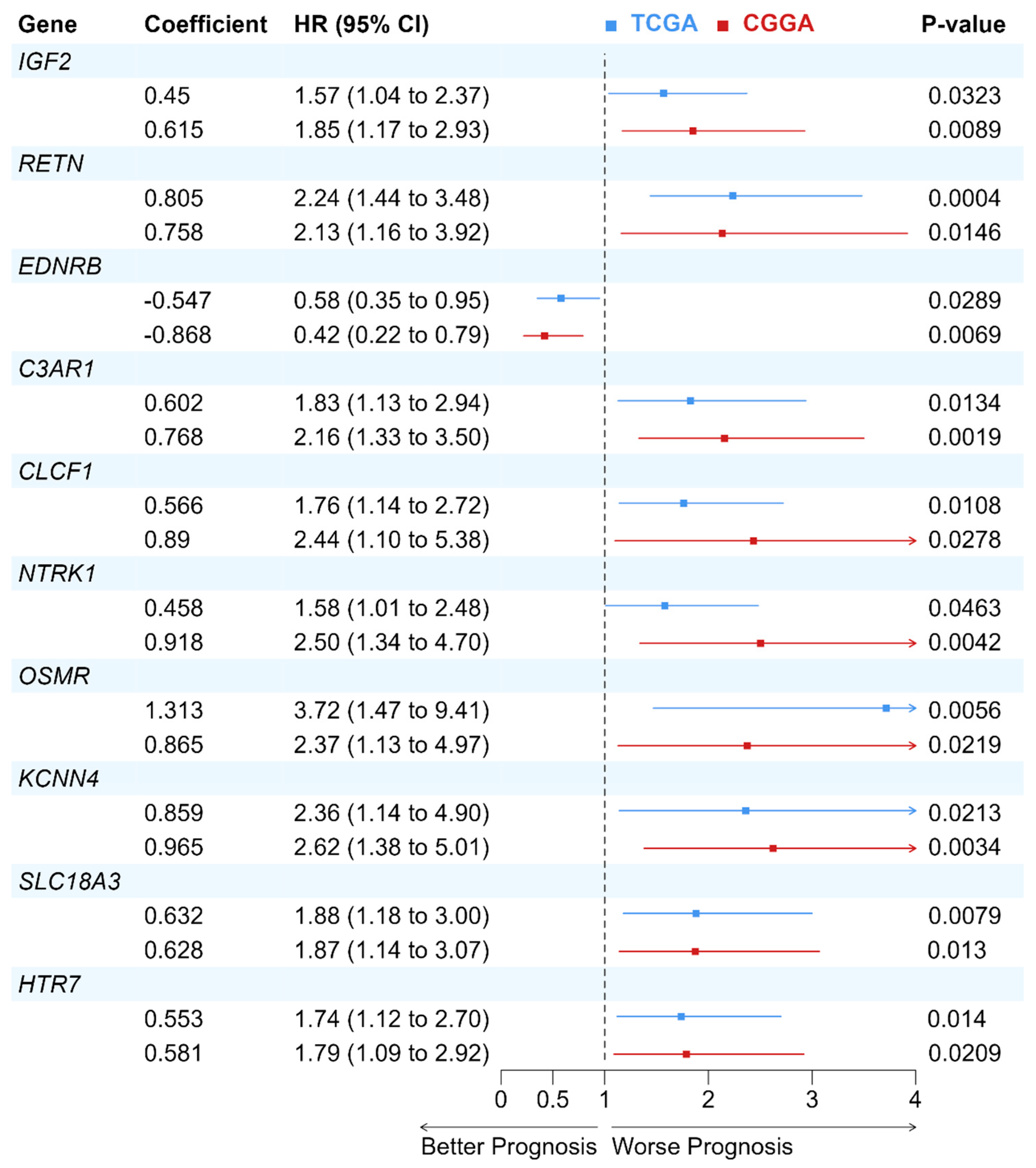 3.2. IGF2, RETN, EDNRB, C3AR1, CLCF1, NTRK1, OSMR, KCNN4, SLC18A3 and HTR7 Are the Common Prognostic Genes in TCGA and CGGA GBM Cohorts