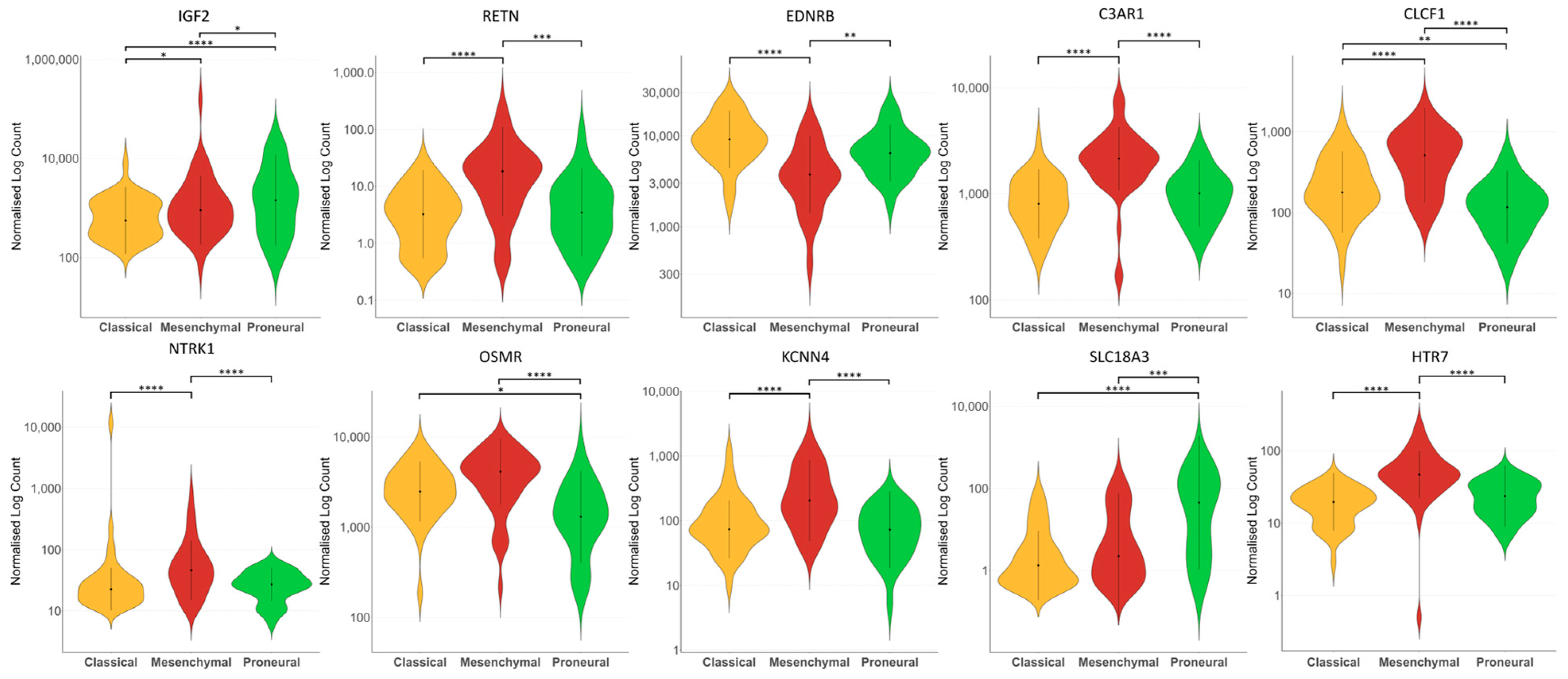 3.6. GBM Mesenchymal Subtype Showed High Expressions of RETN, C3AR1, CLCF1, NTRK1, OSMR, KCNN4, and HTR7 Compared to Classical and Proneural Subtypes