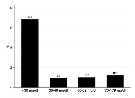 We analyzed 140 subjects, with a mean age of 54.3 (8.1) years and 62.9% women. The median Lp(a) was 15.2 (interquartile range: 6.7–44.5) mg/dL; 68.6% had Lp(a) < 30 mg/dL, 9.3% presented with levels of 30–49 mg/d, and 22.1% of the cohort had Lp(a) > 50 mg/dL (Figure 1). As shown in Table 1, no differences were observed in mean age, sex, or lipid profile in subjects with Lp(a) below or above 50 mg/dL; alkaline phosphatase (ALP) was significantly higher in subjects with Lp(a) > 50 mg/dL.