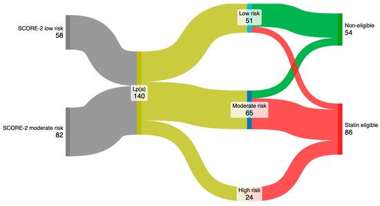 After incorporating Lp(a) values into the SCORE-2 assessment, 22.6% of individuals initially of low risk were reclassified to moderate risk, and 77.4% were reclassified from moderate to high risk (Figure 2). Furthermore, 19.6% of patients reclassified as low risk had LDLc > 150 mg/dL, 80% of those reclassified to moderate risk had LDLc > 100 mg/dL, and all subjects reclassified to the high-risk group had LDL > 70 mg/dL. As a consequence, 61.4% (86 subjects) were considered eligible for treatment with statins.