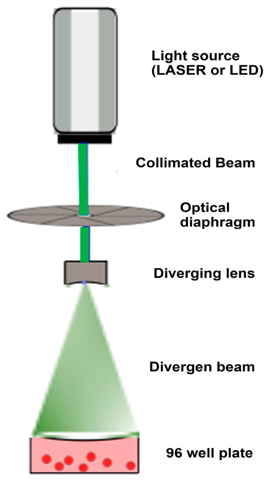 A custom optical irradiation system was designed and built to ensure precise and homogeneous light delivery [15]. The experimental setup is depicted in Figure 1. Two types of light sources were used: low-power LASER diodes (405 nm, 532 nm, 629 nm) and high-intensity Light-Emitting Diodes (LEDs) (457 nm, 517 nm, 630 nm). The light beam from each source was directed vertically onto the culture plate and expanded using a diverging lens to ensure that the irradiation area completely covered the surface of each well, guaranteeing a uniform energy distribution. The distance from the final optical element (diverging lens) to the surface of the cell culture medium was fixed at 10 cm for all experiments.
