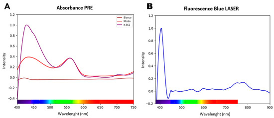 Spectroscopic characterization of the K-562 cell line for the definition of the Optical Therapeutic Window. (A) shows the absorbance spectrum, where K-562 cells (purple line) exhibit distinctive absorption peaks in the blue (~430 nm) and green (~560 nm) regions compared to the culture medium alone (red line), indicating the presence of endogenous chromophores. (B) presents the emission spectrum of the cells when excited with a 405 nm LASER; in addition to the sharp peak corresponding to scattered excitation light, a broad band of resulting fluorescence is observed in the near-infrared region (720–810 nm). Together, these spectra confirm the ability of cellular components to absorb and re-emit light energy, establishing the basis for selecting therapeutic wavelengths.