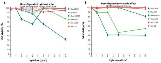 Dose-dependent effect of LASER and LED irradiation on the viability of K-562 cells. The figure shows the percentage of viable K-562 cells 24 h after irradiation, quantified by two complementary methodologies. (A) Cell viability as measured by the Trypan Blue exclusion direct count assay. (B) Cell viability as determined by the MTT metabolic activity assay. In both assays, only the 532 nm (green) LASER induced a significant, dose-dependent reduction in cell viability, while other wavelengths and all LED sources showed minimal effect. Data points represent the mean of three independent experiments. Circles denote LASER sources and diamonds denote LED sources for each corresponding color (Blue: ~405/457 nm; Green: ~532/517 nm; Red: ~629/630 nm).