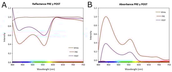 Reflectance (A) and absorbance (B) spectra of K-562 cells before (PRE) and after (POST) irradiation with a green LASER at 10 J/cm2. (A) shows an increase in reflectance after treatment, consistent with a lower photon capture by the decimated cell population. Complementarily and more significantly, (B) reveals a drastic decrease in the absorbance signal in the treated sample (POST, purple line) compared to the control (PRE, red line). This reduction, statistically significant (p = 0.001), serves as a direct biophysical signature of the loss of viable cells, corroborating the potent cytotoxic effect of the treatment.