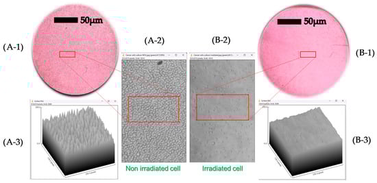 The micrographs were captured with the aforementioned inverted microscope equipped with a digital camera (SC50, Olympus, Tokyo, Japan). The density of live cells before and after optical irradiation treatment was obtained by extracting information from the micrographs. A 3D surface plot was generated, showing a greater number of peaks in the area corresponding to non-irradiated cells compared to irradiated cells. The results demonstrate that the laser successfully induced controlled cell death in K562 cells. All image analyses were performed using ImageJ software (version 1.53k, National Institutes of Health, Bethesda, MD, USA), utilizing the built-in 3D Surface Plot plugin.